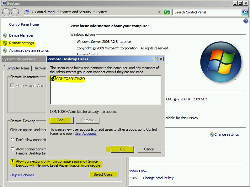 1) Primeiramente vamos habilitar acesso via RDP em nosso DC. Para isso temos que acesse: Start > Control Painel > System and Security > System. Clicar em “Remote Settings” e habilitar a opção “Allow Connections only from computers Running Remote Desktop with Network Level Authentication(More Secure)“, em seguida clique no botão “Select User” e especifique o usuário ou grupo que terá acesso conforme abaixo: