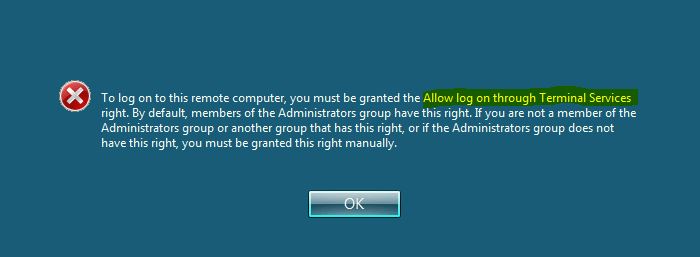 2) Após habilitado Remote Desktop tente acessar o DC a partir de outro sistema utilizando Remote Desktop e verá a mensagem abaixo mostrando que ainda não é possível obter acesso. Isso ocorre pelo fato do usuário não ter o direito “Allow Logon Through Terminal Services“: