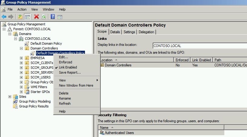 3) Por último é necessário atribuir o direito “Allow Logon Through Terminal Services“, para isso no DC clique em: “Start” > “Administrative Tools” > “Group Policy Management“. Edite a Politica “Default Domain Controller Policy“.