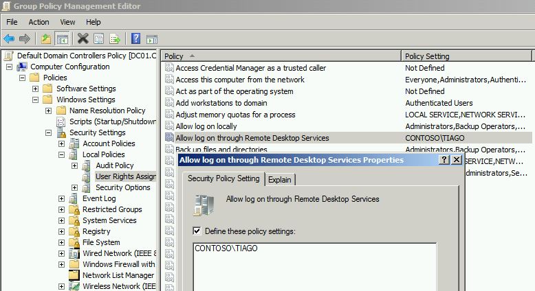 Recebo com frequência dúvidas sobre como permitir que um usuário comum efetue logon via RDP (Remote Desktop) em um DC (Controlador de Domínio) . Bom antes de mostrar como proceder gostaria de deixar claro que tal prática não é recomendada e que traz alto risco a infraestrutura como um todo, ou seja, permitir que um usuário que não é um administrador ou operador de servidor ter acesso ao desktop de um DC de longe não é uma boa ideia.